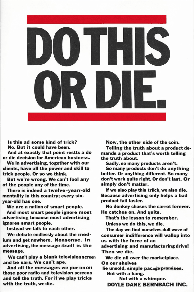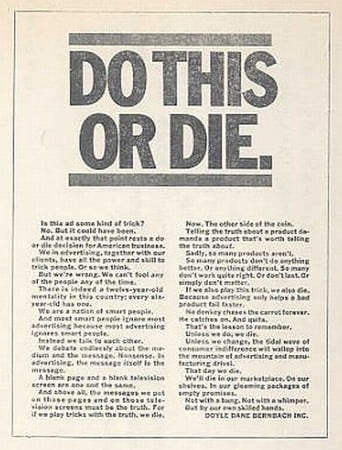 The blogpost spured an interesting discussion. One advertiser sent me an ad from Bob Levenson, a guy from an agency called DDB. The ad is from the late 1960s. It is a manifesto for good products and against tricking people with advertising for bad products.